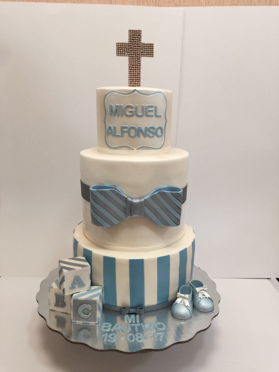 Pastel de fondant de dos pisos con oso, corazones azules punteados y detalles de glaseado.