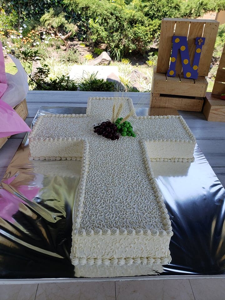 Pastel de fontant de un peso elevado en color blanco con detales en rosa, un rosario, tres rosas de azucar y letrero de mandera