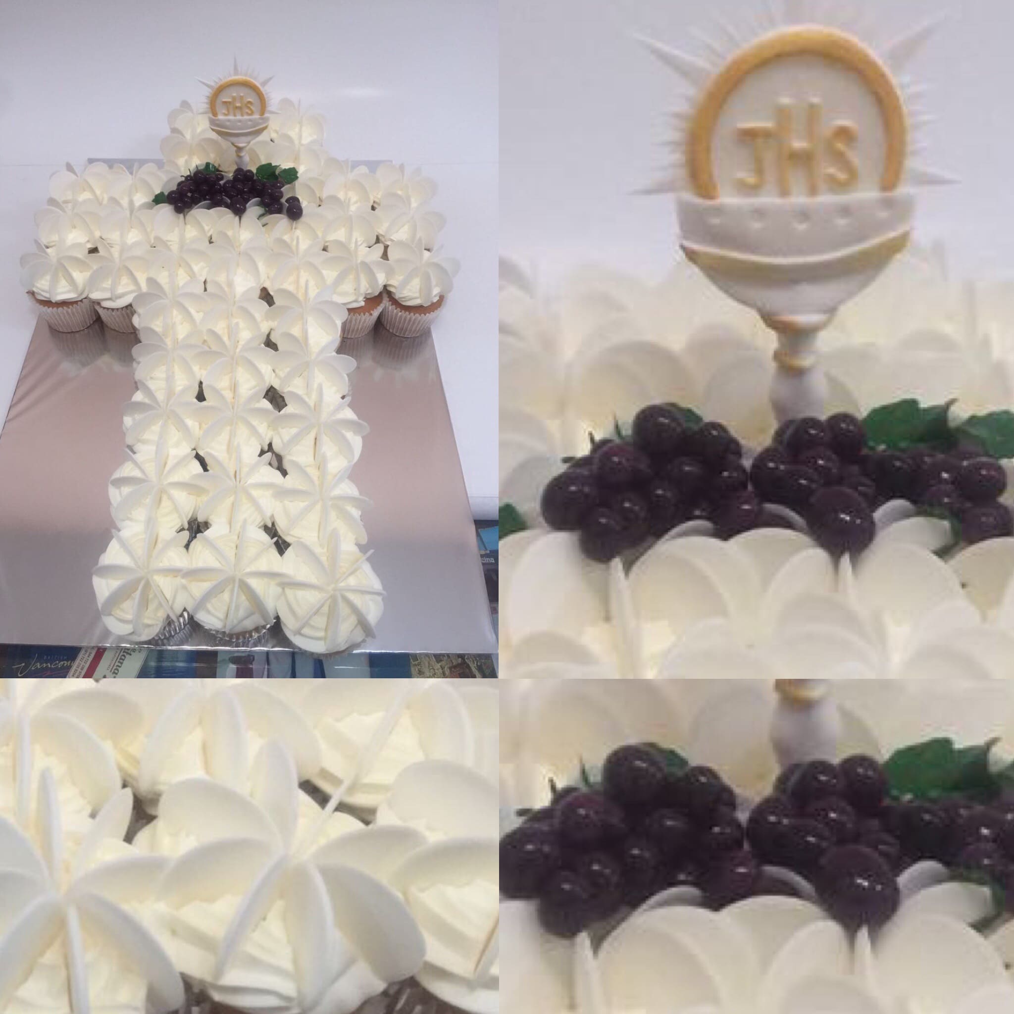 Pastel de fondant rosa con blanco, detalles de 3 peonias y pétalos en tres pisos y decoración con glaseado con cruces.