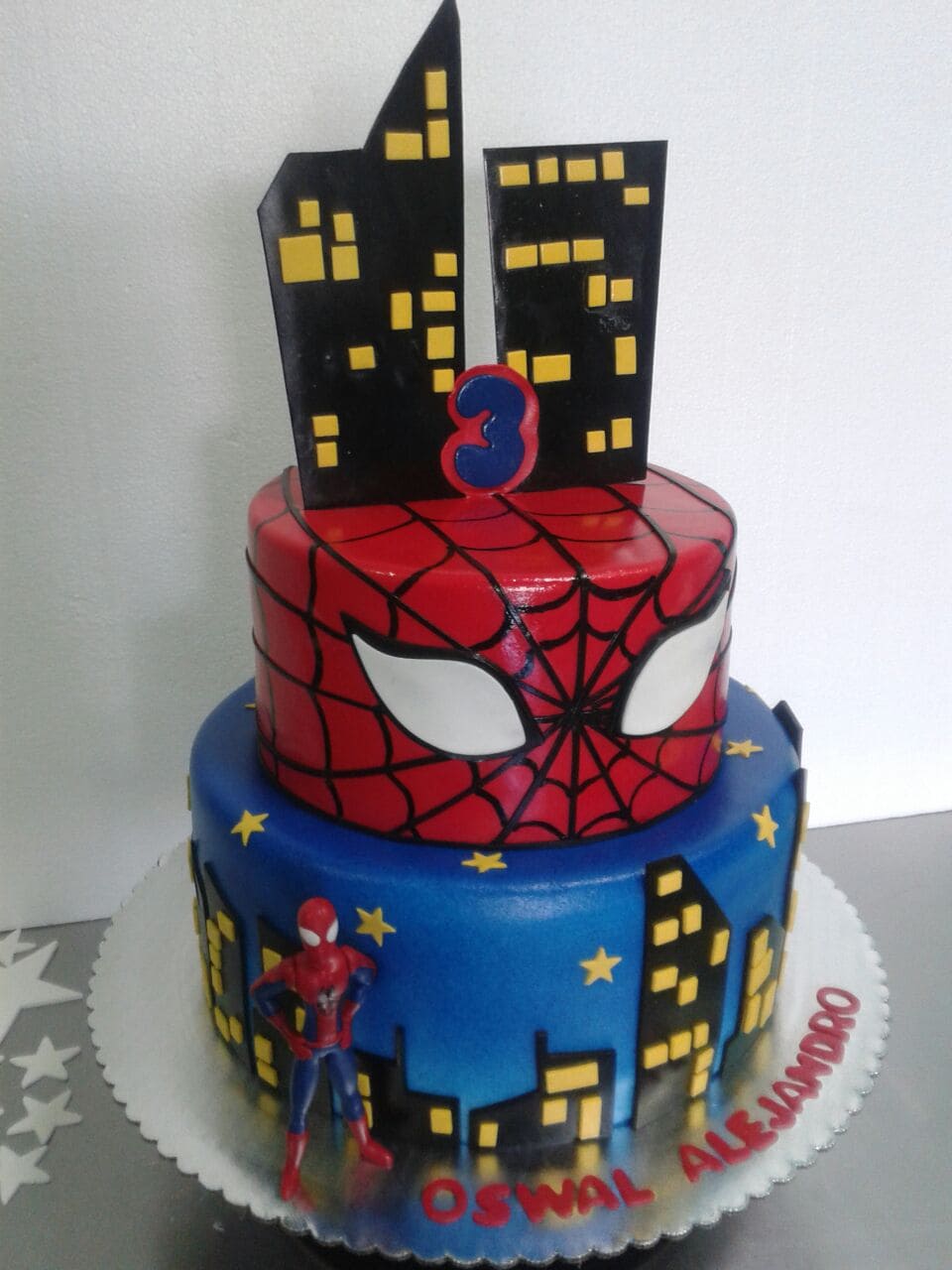 Pastel de dos pisos en fondant con logo en relieve en fondant y seis figurines de los personajes de la caricatura