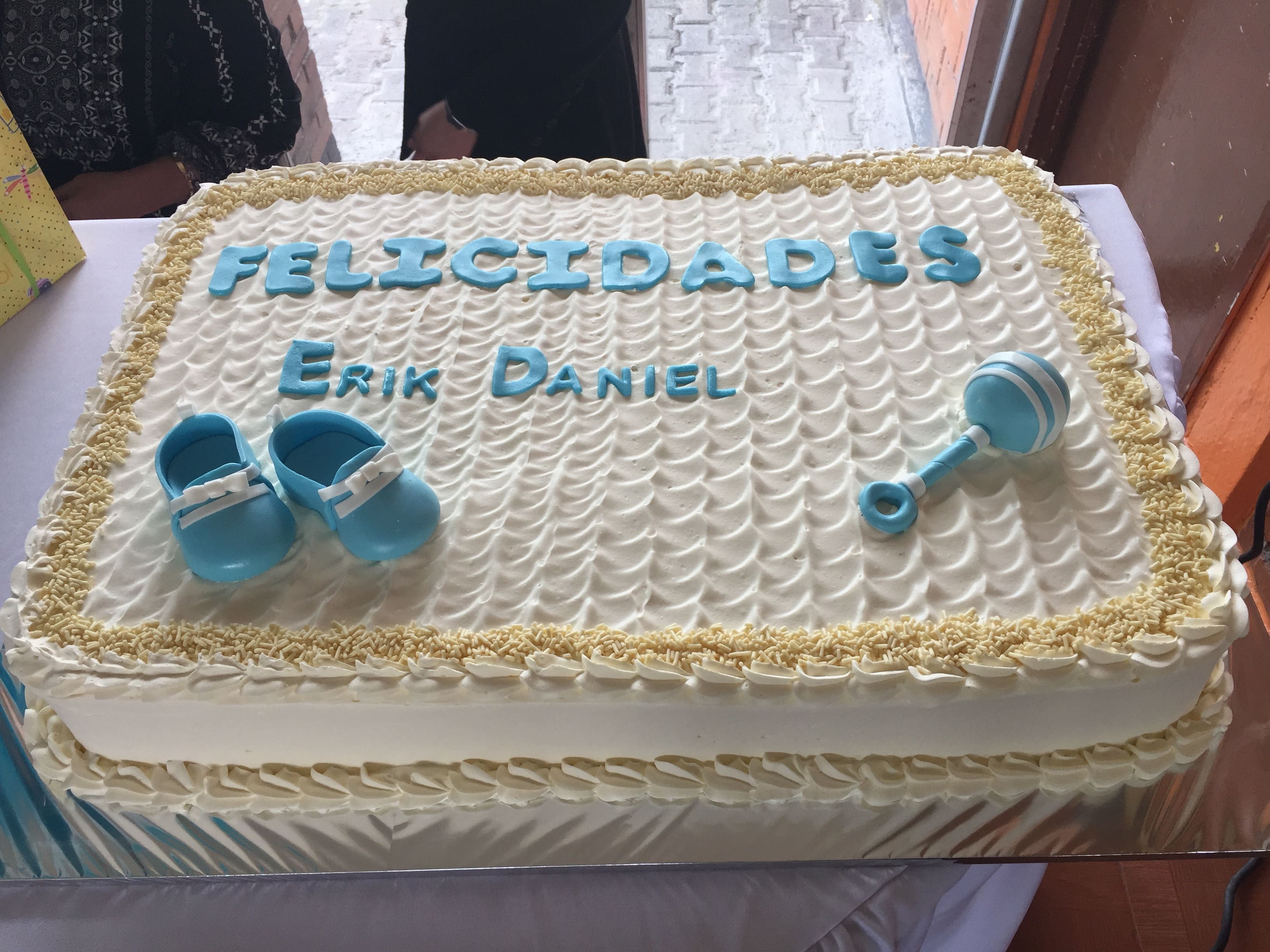 Pastel de fondant alto con globo aerostático de unicel azul turquesa con ositos, detalles de nubes y macarrones