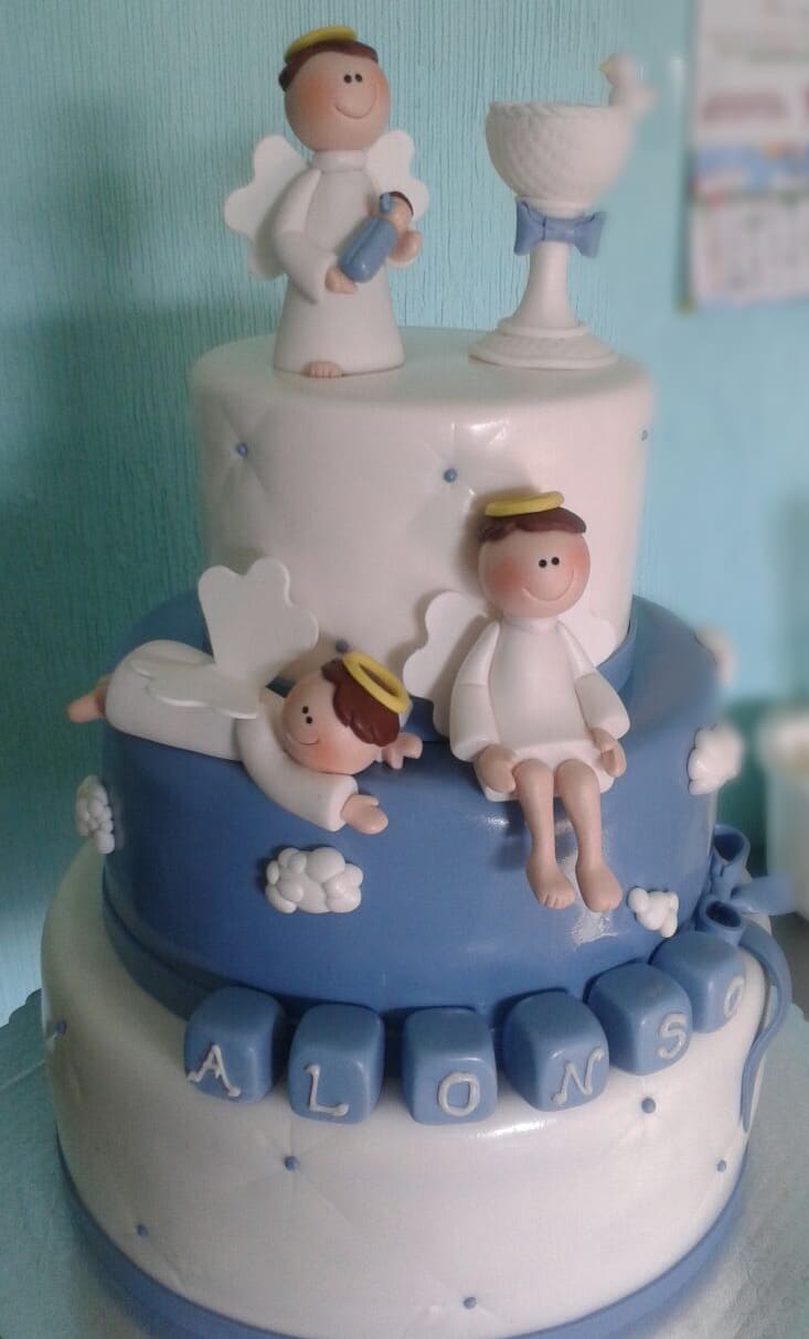 Pastel de fondant de tres pusos con dos orquideas de azucar y cruz