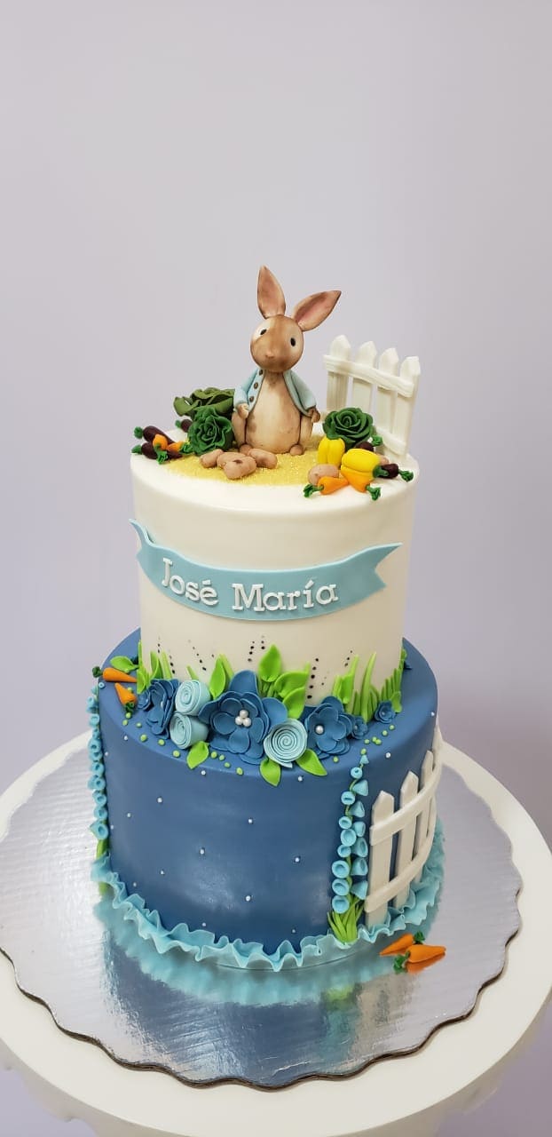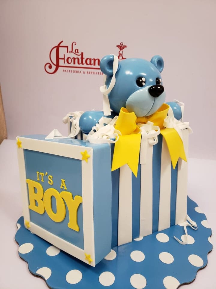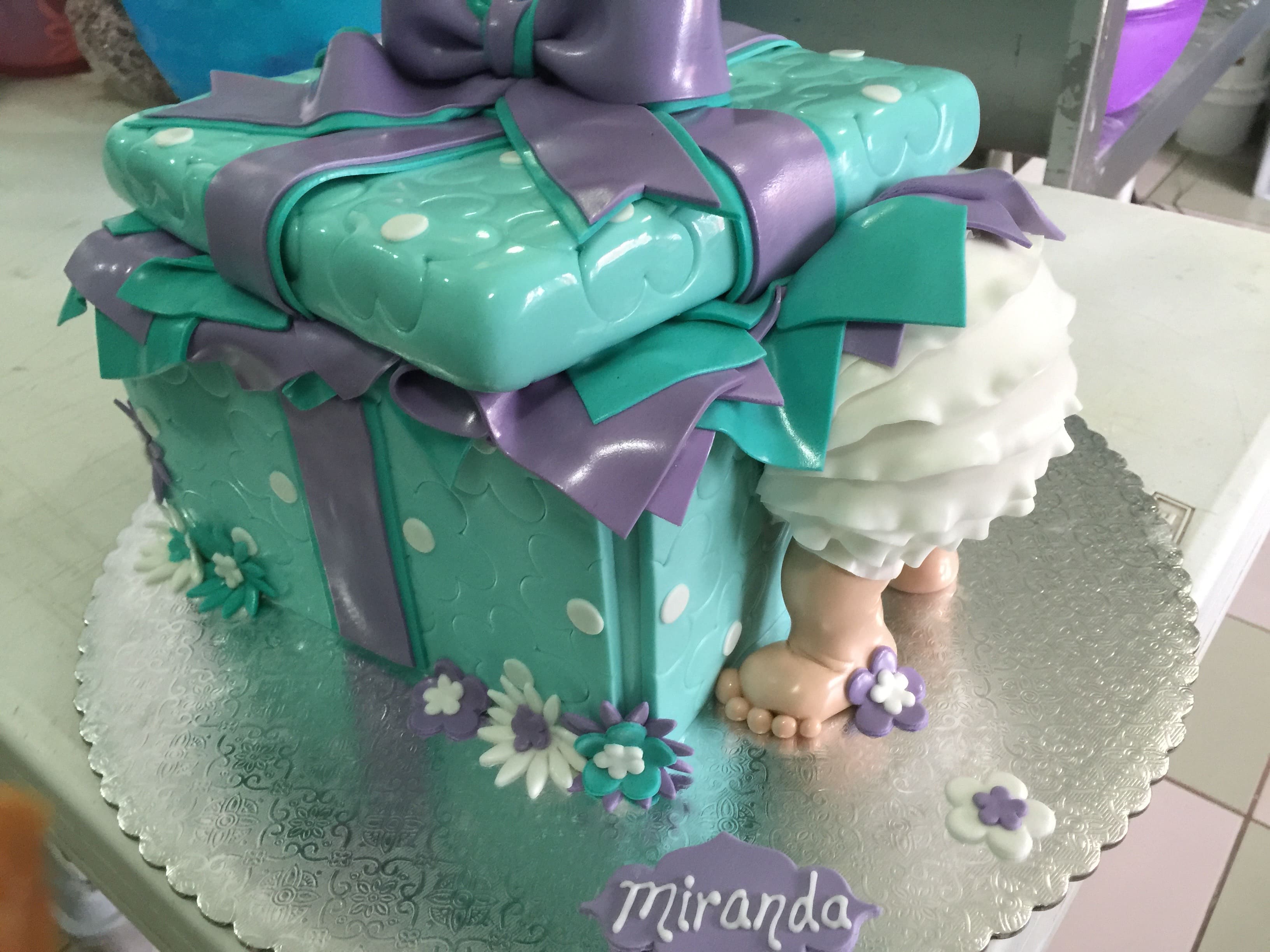 Pastel de fondant con zapatos rosas y moño detalles de mamila y chupón, así como pequeñas flores de fondant