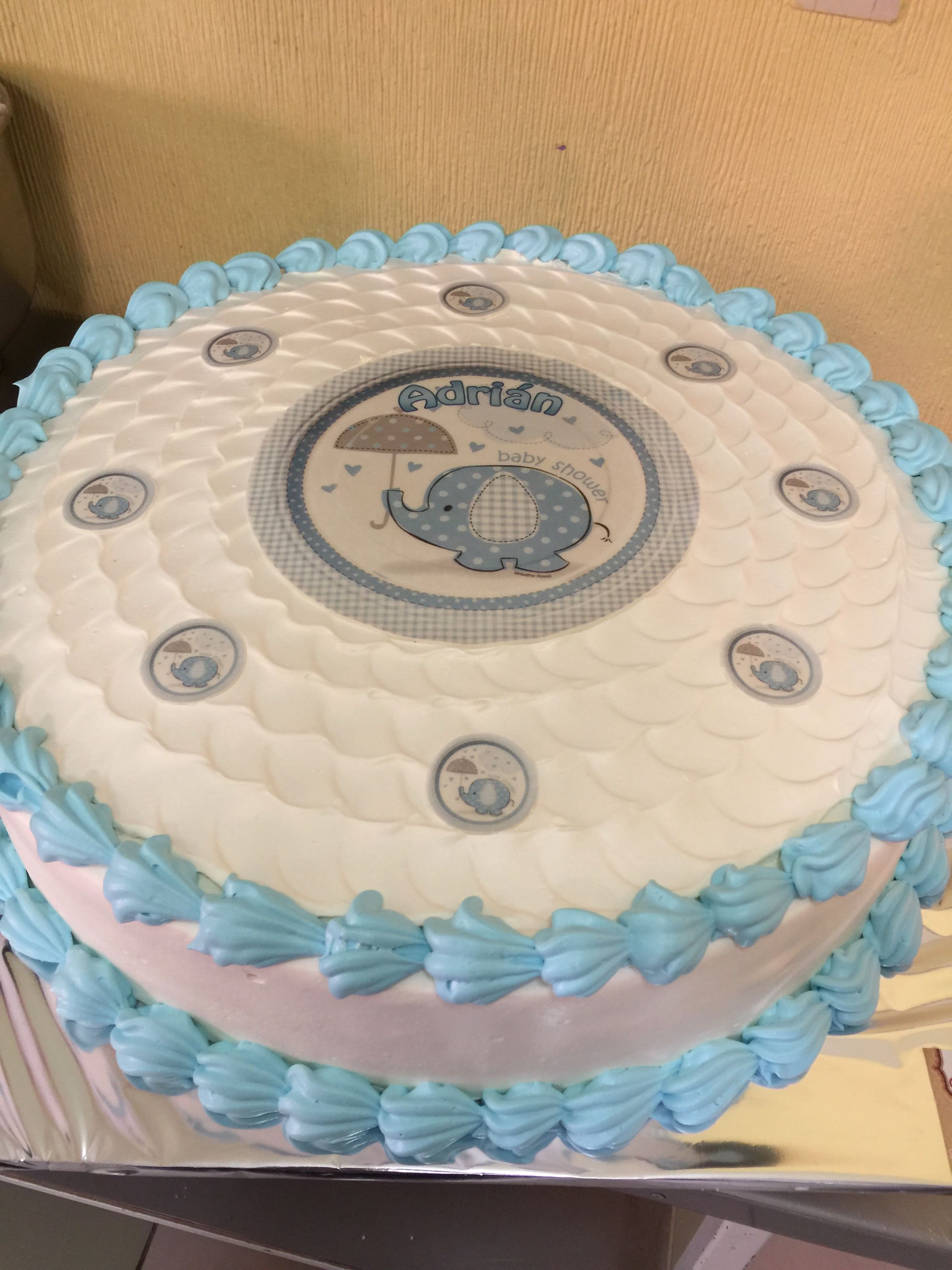 Pastel de fondant de tres pisos con cuna, tendedero de ropita de bebé y huellitas de pies
